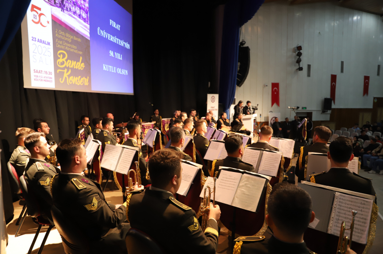 Fırat Üniversitesinin kuruluşunun 50. yıl dönümü etkinlikleri kapsamında, Malatya 2. Ordu Bölge Bando Komutanlığı ile Üniversite Devlet Konservatuvarı iş birliğinde düzenlenen ortak konser, unutulmaz bir müzik ziyafeti sundu.
