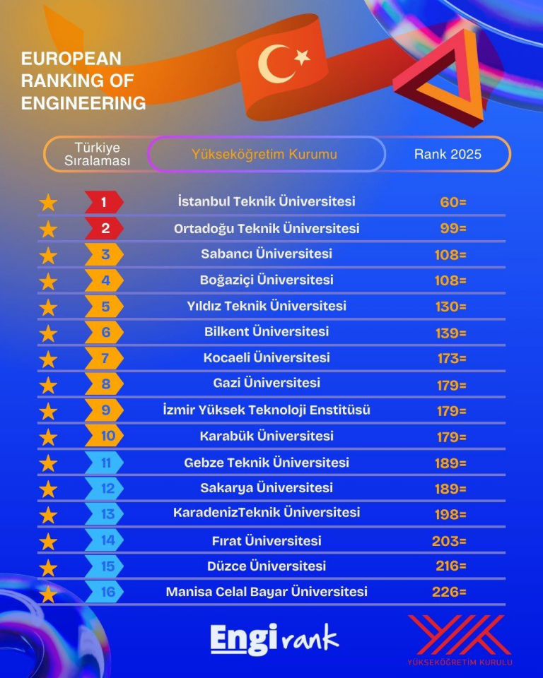 İlk 100’de yer alan İTÜ ve ODTÜ’nün yanı sıra Boğaziçi Üniversitesi ve Sabancı Üniversitesi 108. sırayı paylaştı. Yıldız Teknik Üniversitesi 130., Bilkent Üniversitesi 139., Kocaeli Üniversitesi 173., Gazi Üniversitesi, İzmir Yüksek Teknoloji Enstitüsü ve Karabük Üniversitesi 179., Gebze Teknik Üniversitesi ve Sakarya Üniversitesi 189., Karadeniz Teknik Üniversitesi 198. sırada yer alarak ilk 200’e girme başarısı gösterirken, Fırat Üniversitesi 203., Düzce Üniversitesi 216., Manisa Celal Bayar Üniversitesi ise 226. sırada yer alarak dereceye girdi.
